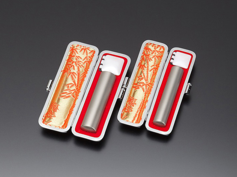 耐食性・耐熱性・(金属としては)軽量な「チタン」の銀行印15.0mm・認め印12.0mmのセットです。男性に好まれるサイズです。印鑑の素材として使われ始めたのはごく最近ですが、天然素材と異なり朱肉の浸食による劣化がない・摩擦で擦り減らない・落としても欠けない(欠けにくい)・粒子密度が高く捺印時に美しい印影を残せるといった特徴があるため、印材としては非常に優れた素材です。梨地シルバーのチタンは高級感・重厚感もあり、人前に出して使う印鑑としても黒印材同等の人気があります。